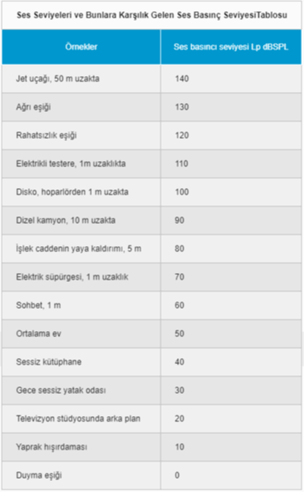 Örnek Gürültü Kaynakları İçin Gürültü Düzeyleri