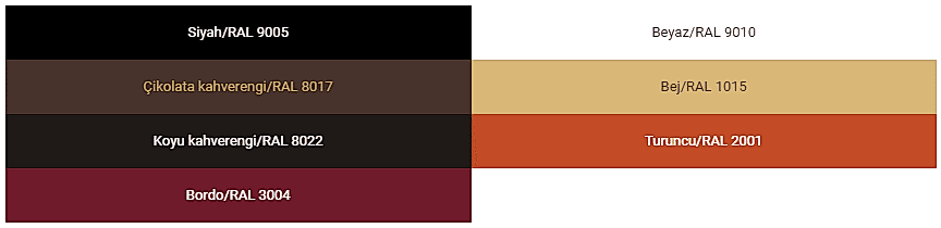 Şişecam Boyalı Cam, standart olarak aşağıdaki renklerde üretilmektedir. İsteğe bağlı olarak farklı RAL renklerinde de üretim yapılabilmektedir.