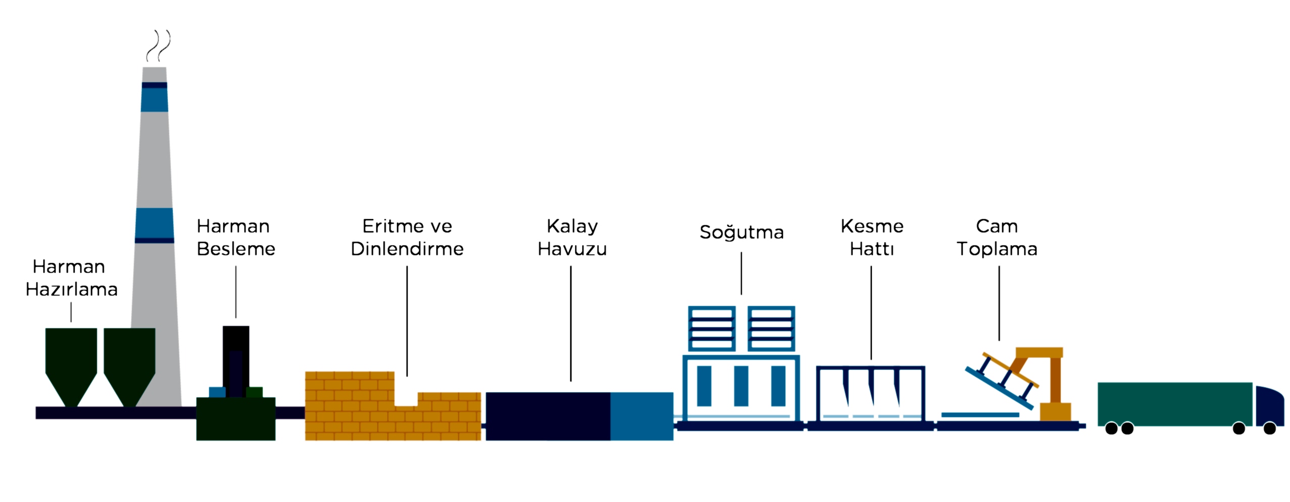 Kum, soda, kireçtaşı başta olmak üzere, belirli özellik ve miktardaki hammaddelerin karışımı olan cam harmanı, fırında yaklaşık 1600°C’de eritilir. Cam eriyiği yaklaşık 1100°’de fırından eriyik kalay havuzuna akıtılır ve camın, kalay üzerinde yüzdürülmesi suretiyle, iki yüzünün hatasız ve birbirine paralel olması sağlanır, aynı zamanda camın kalınlığı ve şerit genişliği oluşturulur. Kalay havuzundan kesintisiz bir şekilde çıkan cam şeridin sıcaklığı kontrollü olarak düşürülerek soğutma bölümünde camın bünyesindeki gerilimler giderilir. Bunu takiben cam, kesme hattında istenilen ebatlarda kesilerek paket halinde toplanır, sevke hazır hale getirilir.